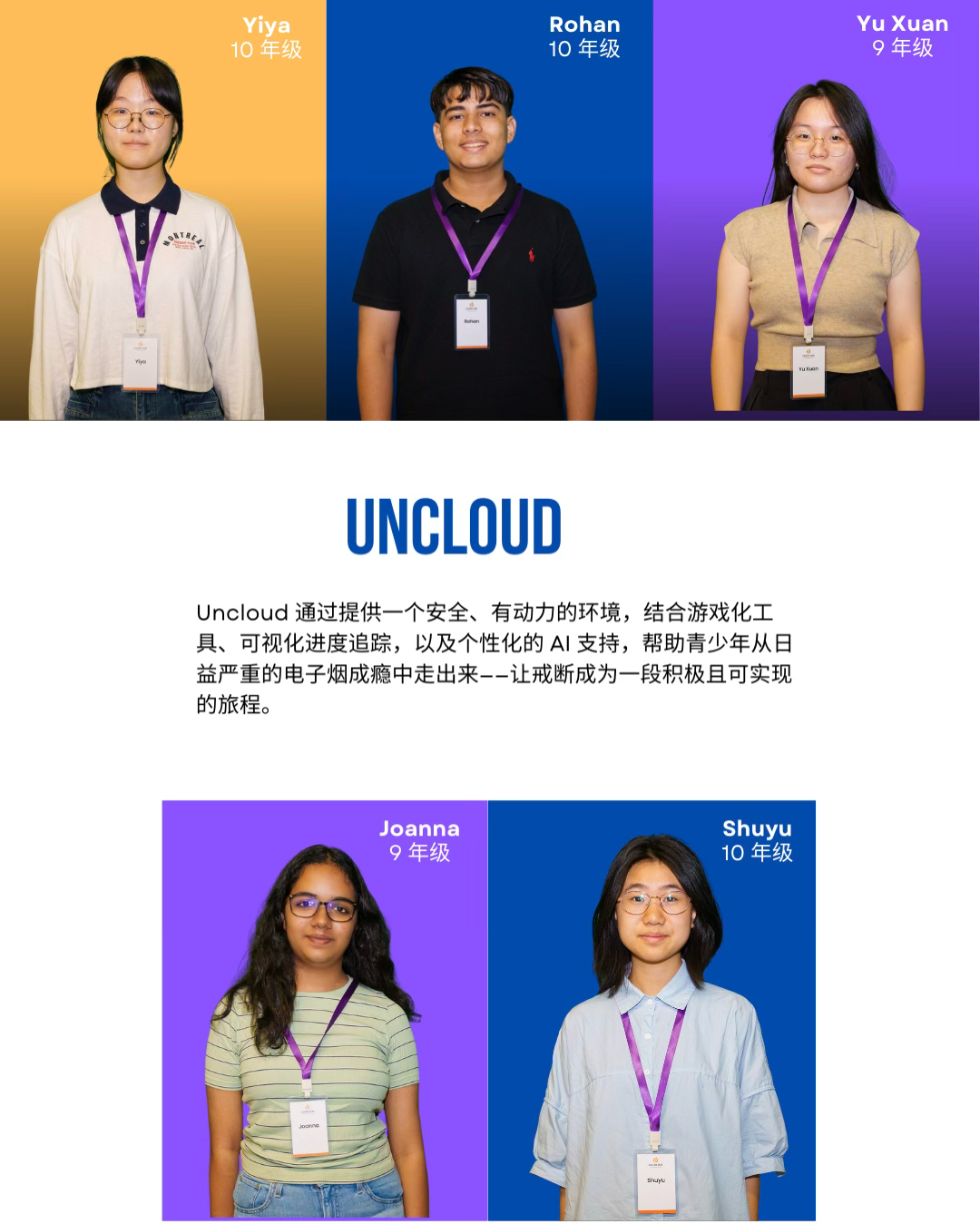 Uncloud 诞生于一群年轻创新者的共同观察与思考之中。他们发现,在同龄人之间,电子烟使用正逐渐成为一个不容忽视的问题,但许多青少年却难以获得一种真正安全、私密、且能被理解的支持方式。过往的应对方式往往依赖恐吓、惩罚或公开暴露,这反而让年轻人感到被评判,而非被帮助。
